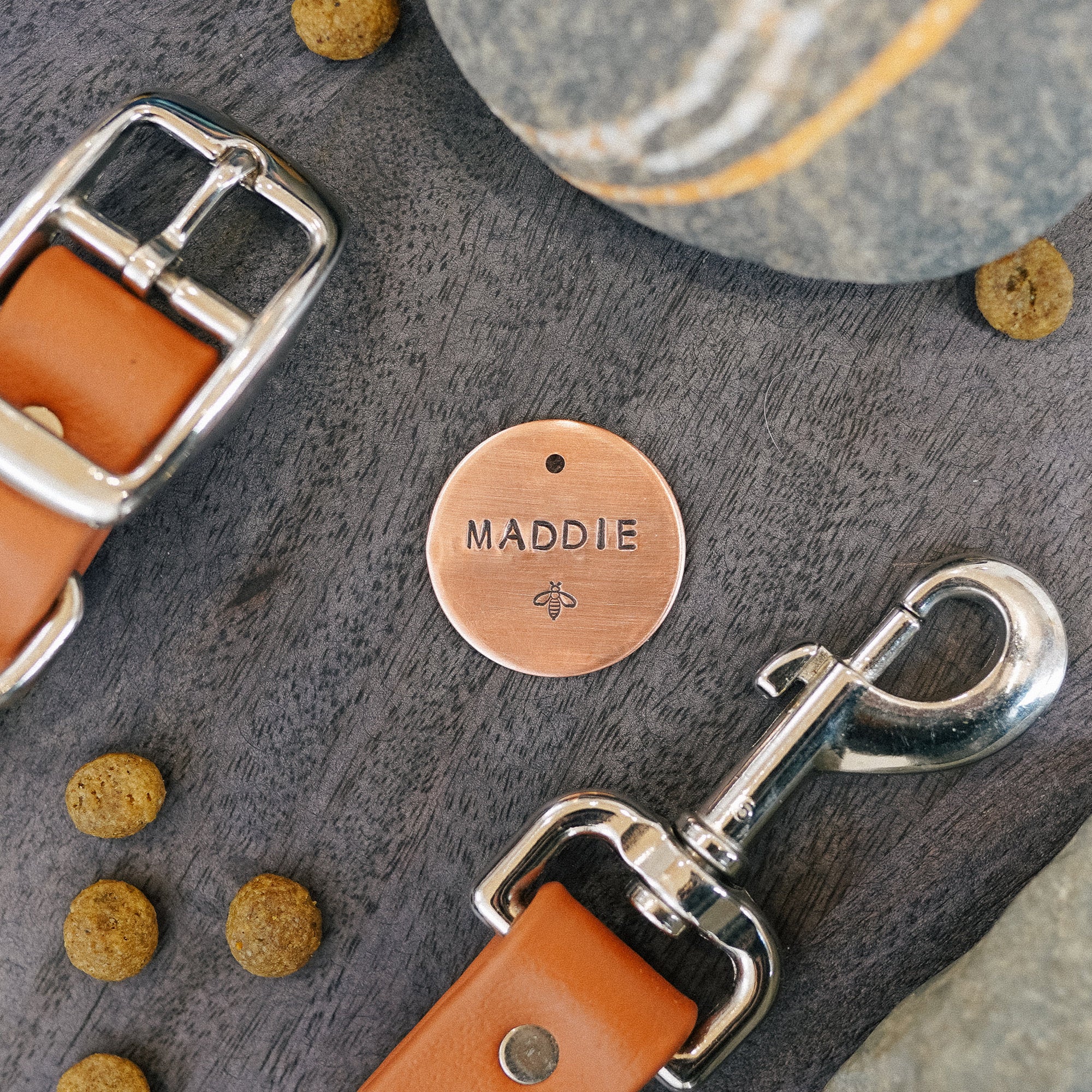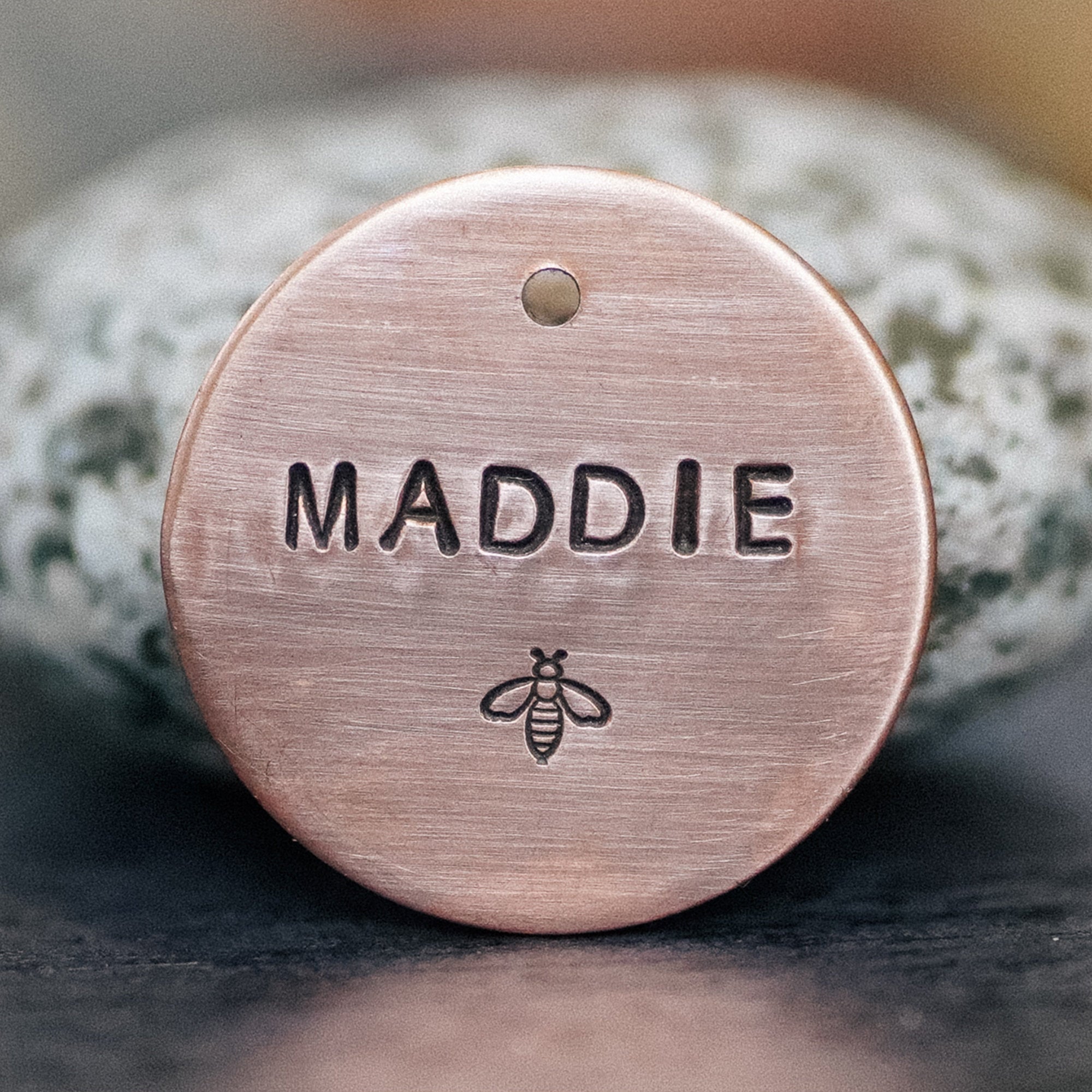 For the dog who’s always buzzing with energy. Our Buzz tag is made for pups who love to explore, chase, and brighten every room they enter! This 1 ¼” tag is hand stamped on your choice of 14ga nickel, brass or copper. Each tag is hand stamped, made to order, and completely unique, no two are ever exactly the same.