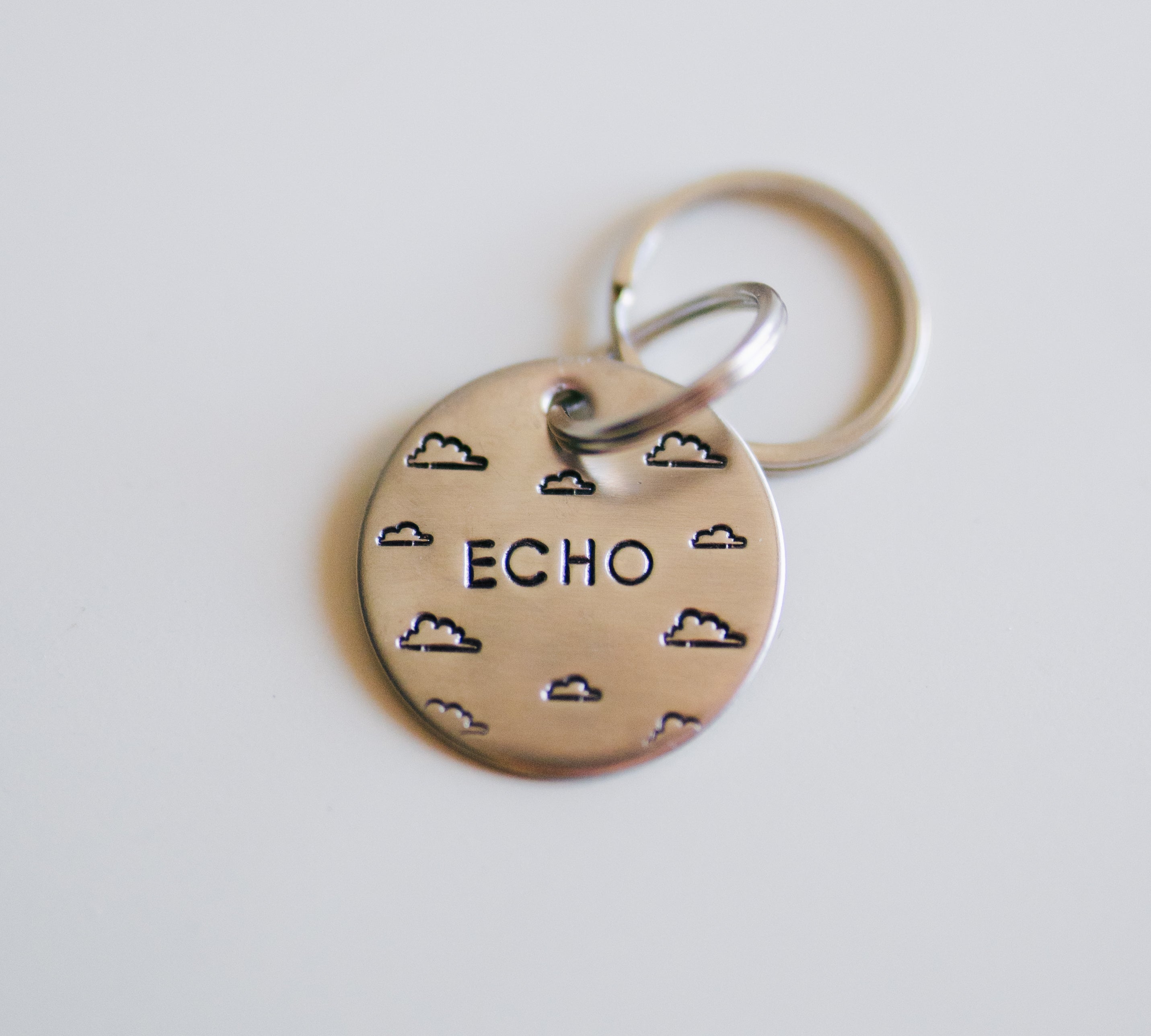 Our Cloudy Skies tag is a 1 ¼” hand-stamped tag made on your choice of 14ga Nickel, Brass or Copper.
