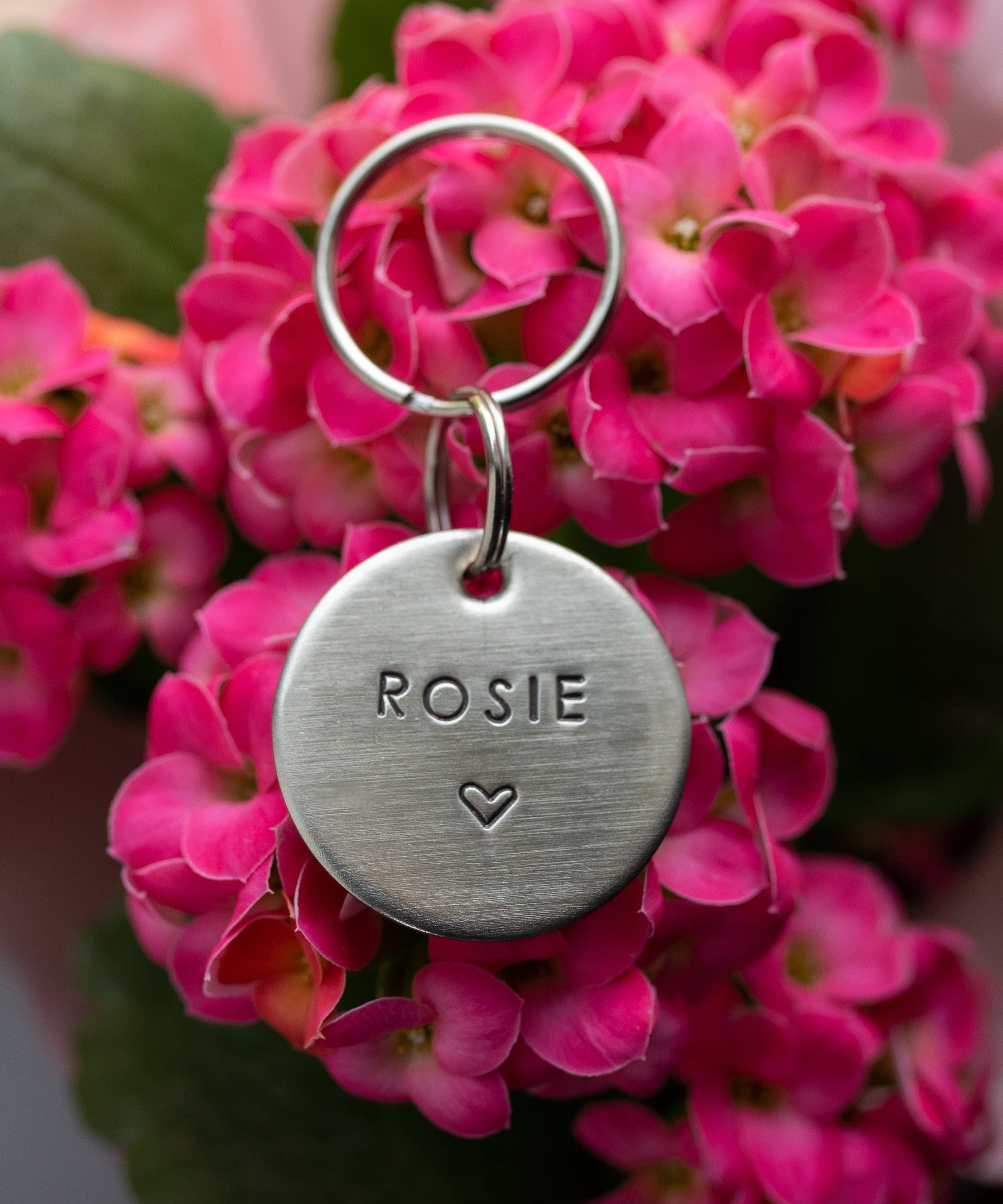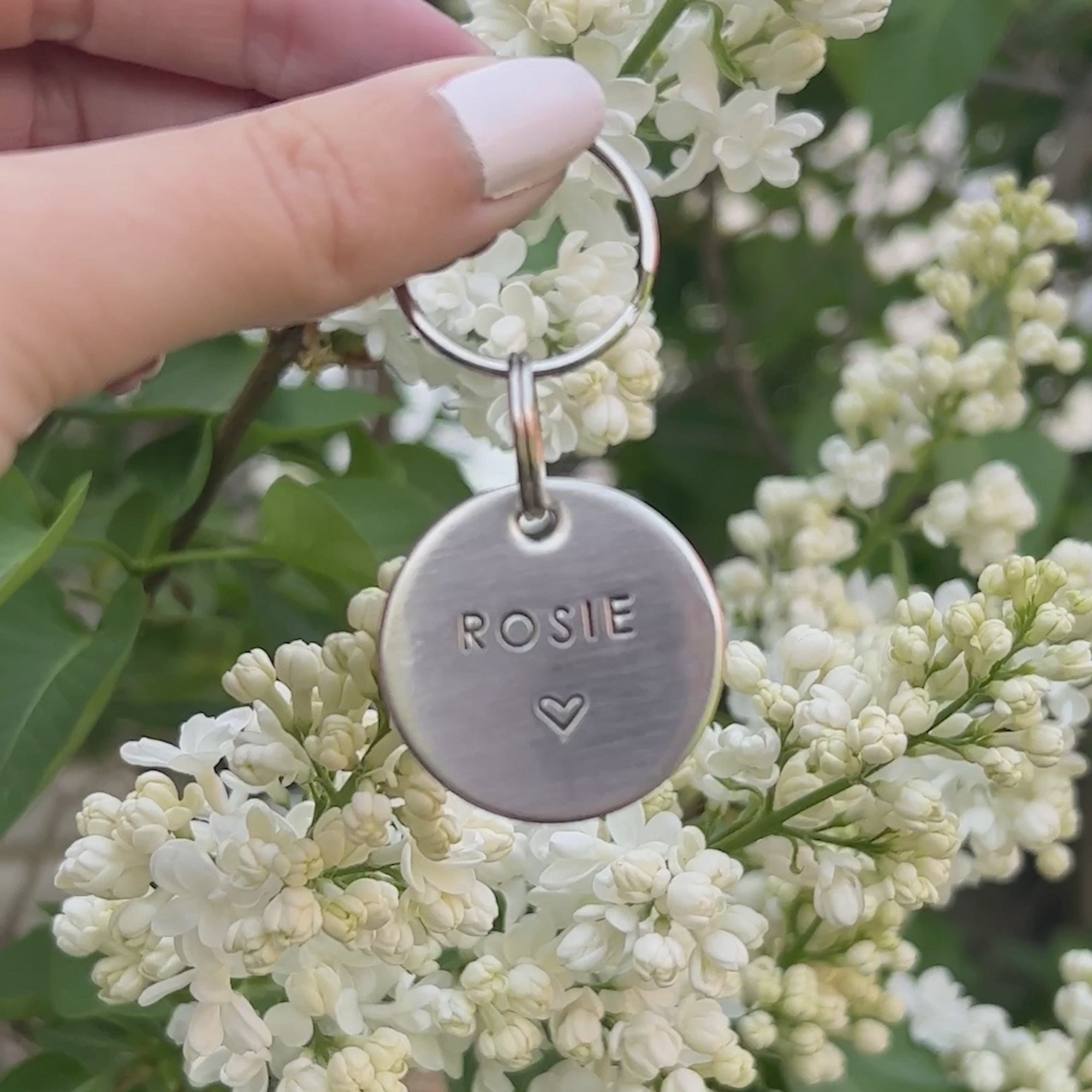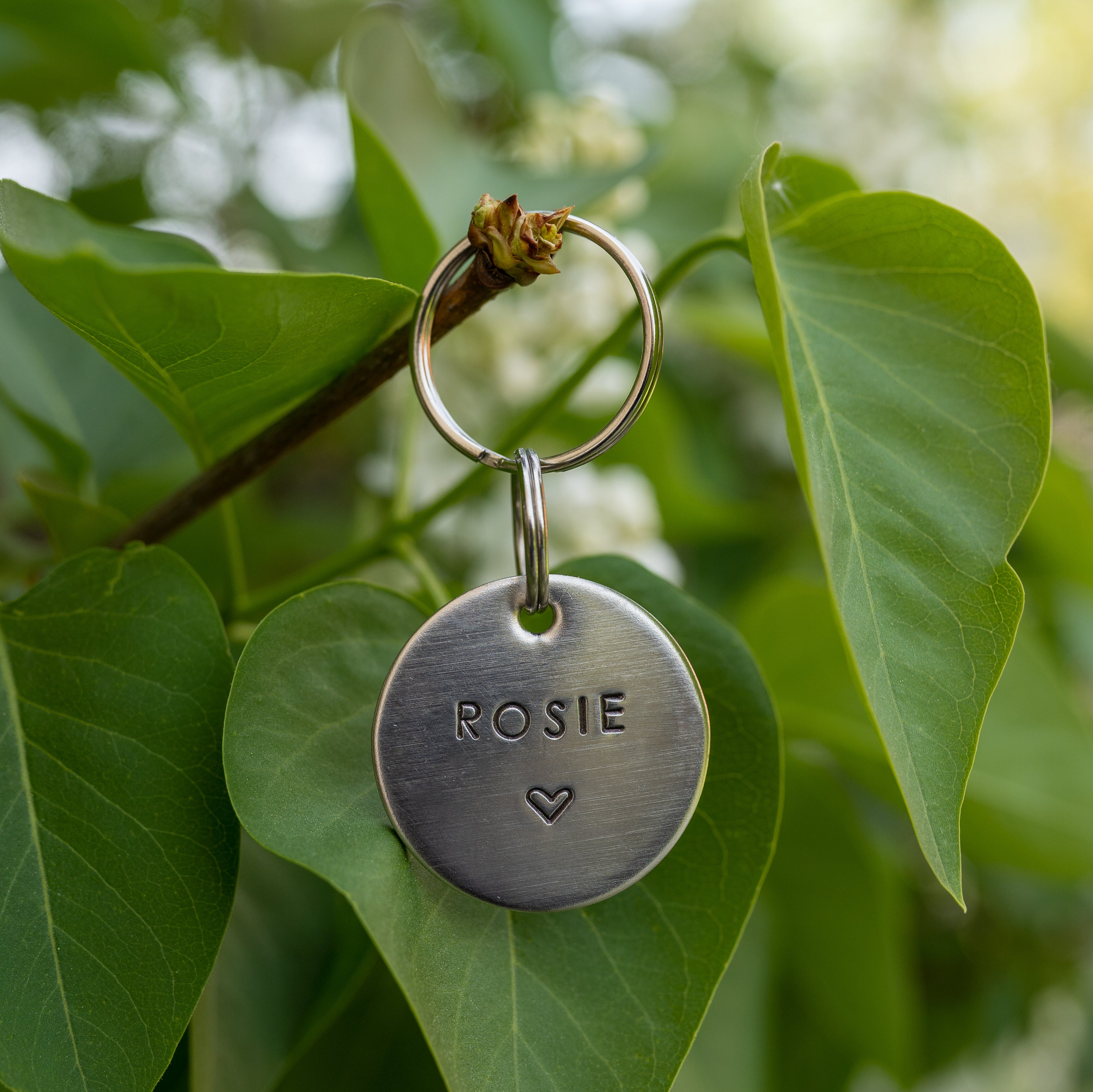 For the pup who wears their heart on their… collar. This tag is made for the dogs who curl up right against you, follow you from room to room, and greet you like you’ve been gone for years, even if it’s only been five minutes. A little token of the big love they give every single day. This 1 ¼” tag is hand stamped on your choice of 14ga nickel, brass or copper. Each tag is hand stamped, made to order, and completely unique, no two are ever exactly the same.