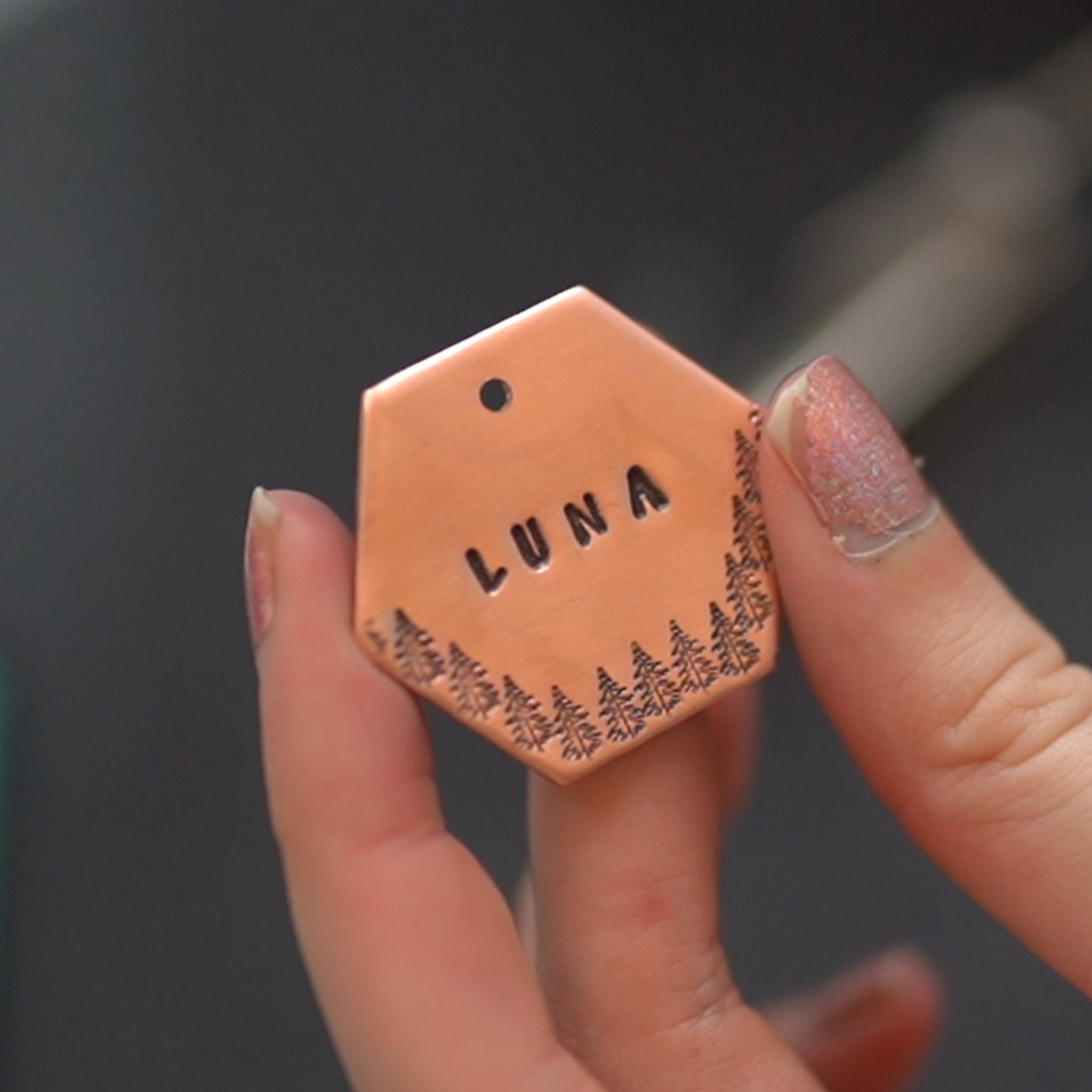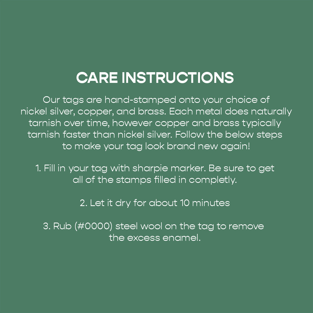 Every letter and design element is stamped one at a time. This can create light markings on the back as the metal shifts, but we do our best to keep this to a minimum.