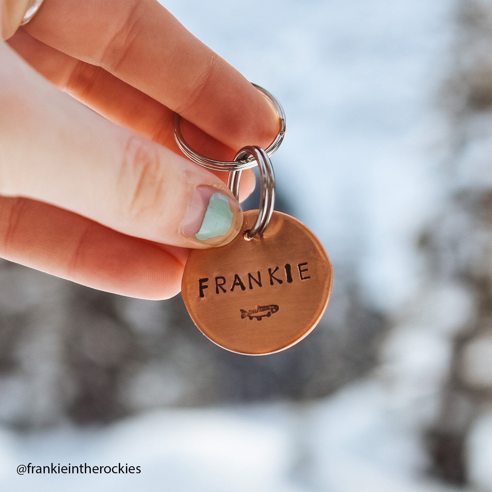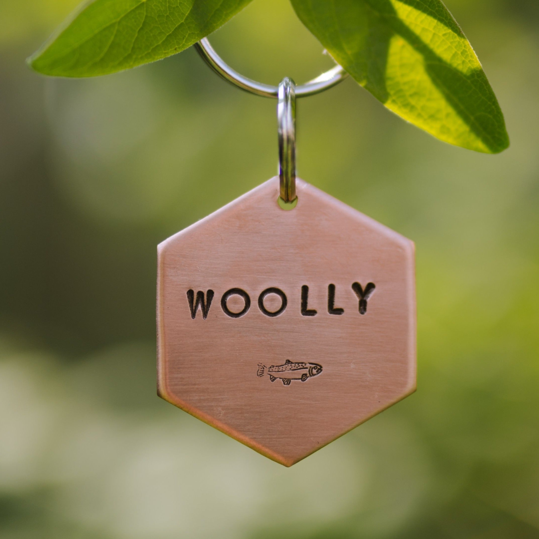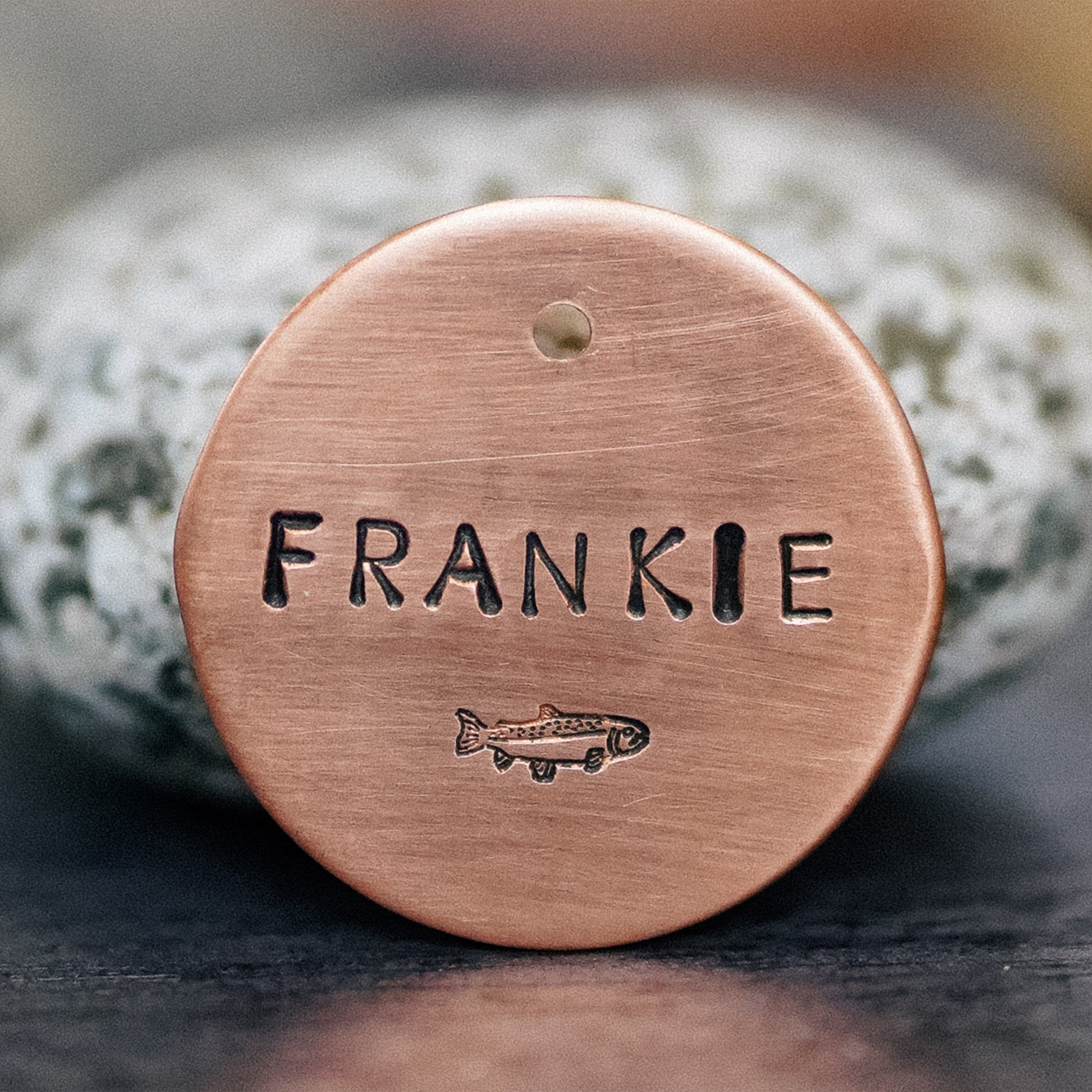 For the dog who’s happiest near water. Our Trout tag is perfect for pups who love swims, splashy adventures, and chasing every ripple, a little reminder of their love for the great outdoors. This 1 ¼” tag is hand stamped on your choice of 14ga nickel, brass or copper. Each tag is hand stamped, made to order, and completely unique, no two are ever exactly the same.
